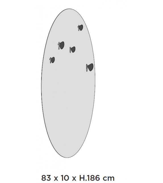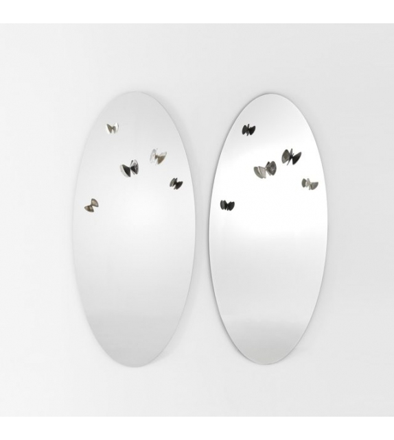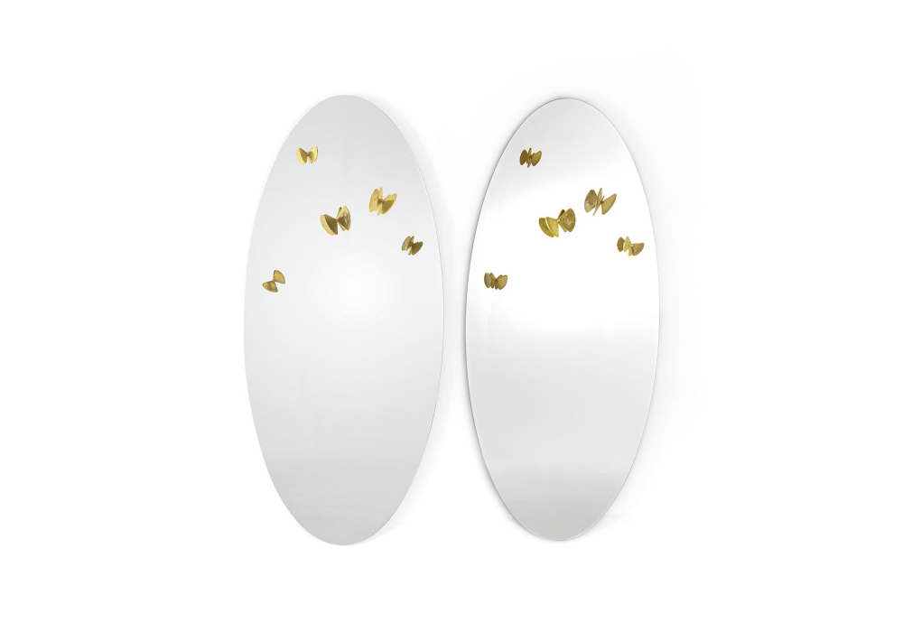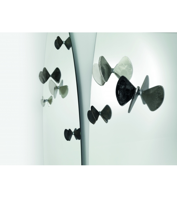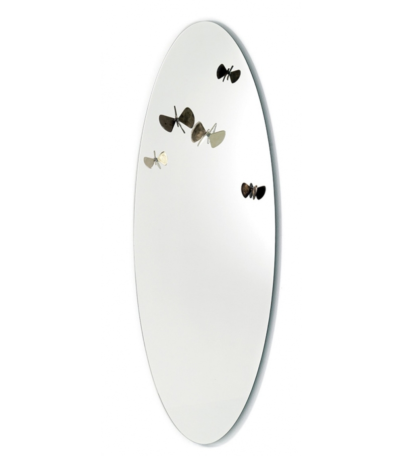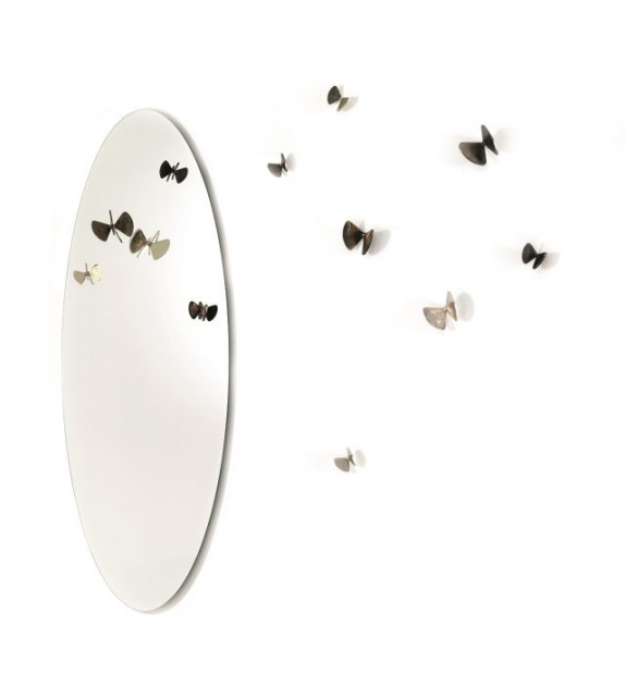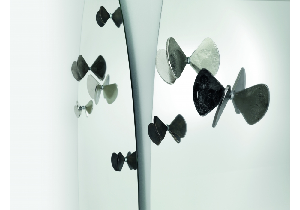 Bice firmato da Roberto Mora per Mogg è uno specchio ovale da parete con 5 farfalle appendiabiti in fusione di ottone. Disponibili nelle finiture miste (nickel lucido, nickel nero, ottone ossidato) oppure in finitura ottone lucido.