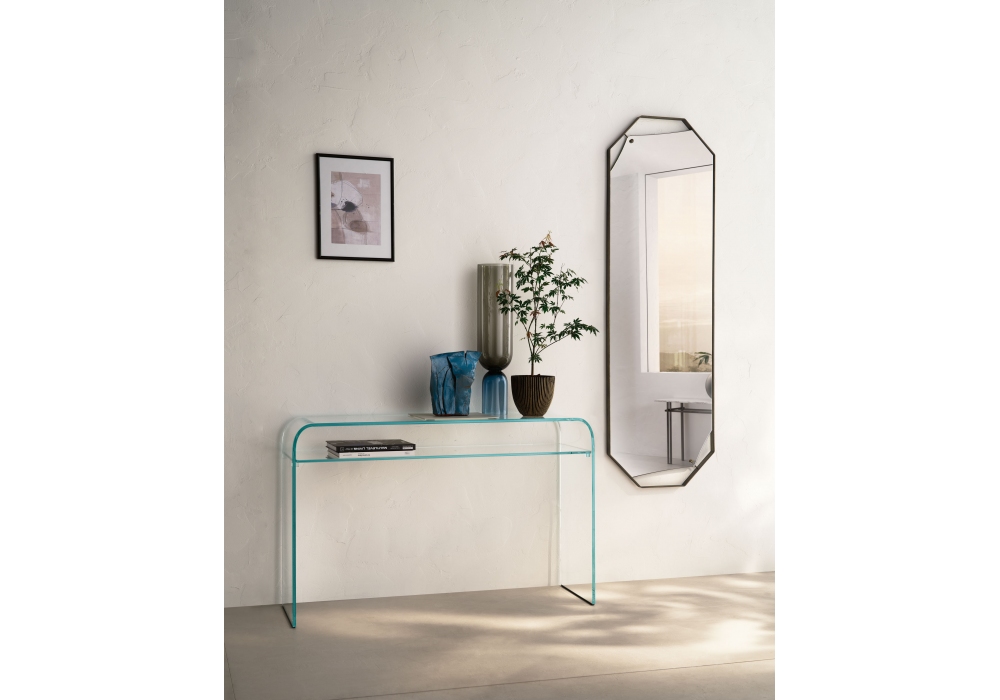 Pinch firmato da Lanzavecchia & Wai per Fiam è uno specchio da terra o parete con cornice in metallo in finitura ottone brunito.