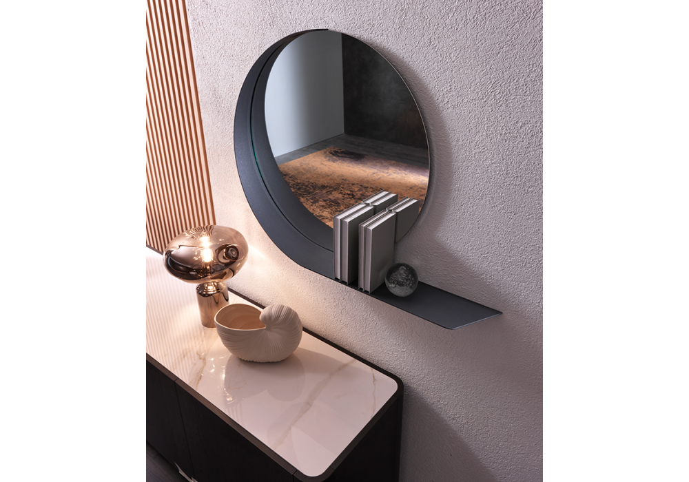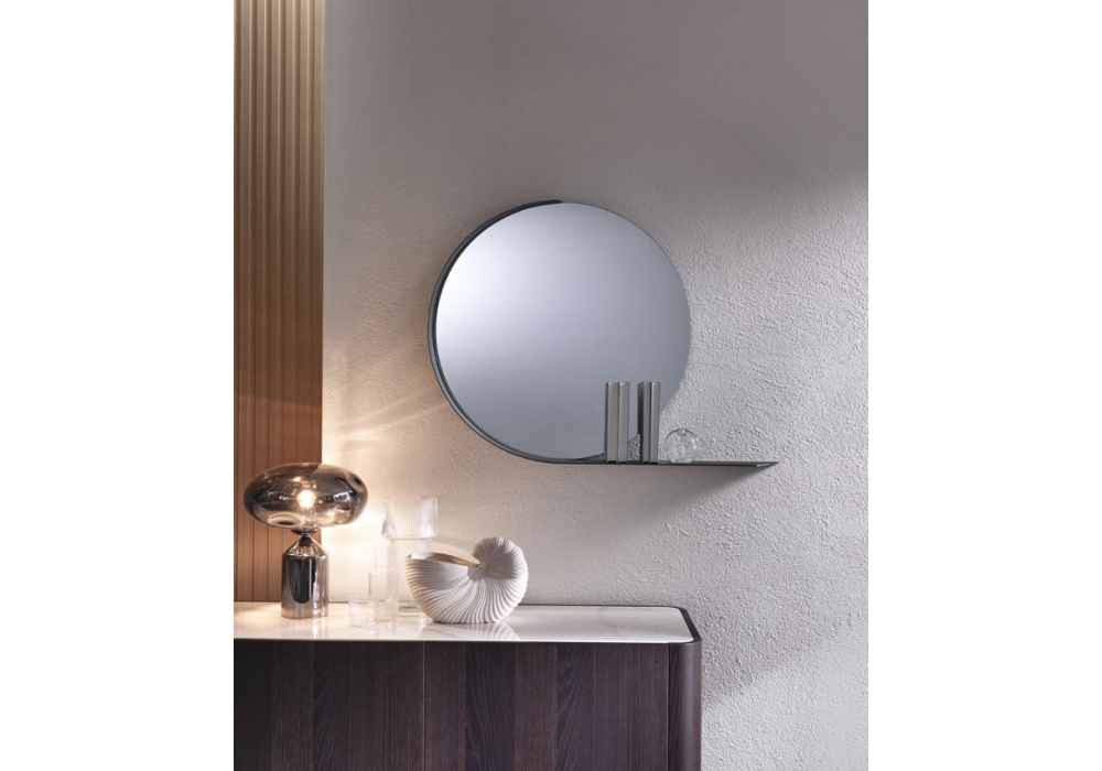 Madame firmato da Riflessi è uno specchio tondo con cornice mensola destra in metallo verniciato. Disponibile in 3 finiture.