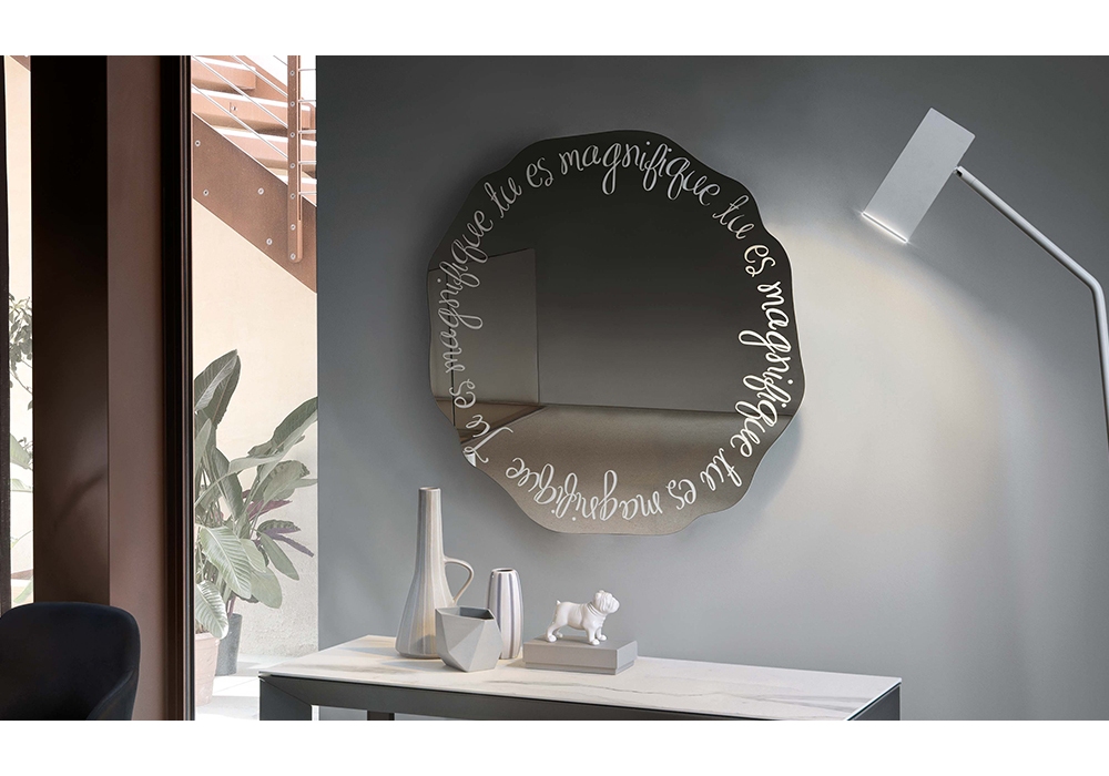 Magnifique firmato da Silvia Maralino per Riflessi è uno specchio tondo realizzato con superfici specchianti, sagomato con serigrafia monocolore “Tu es magnifique”.