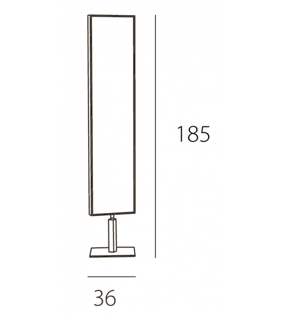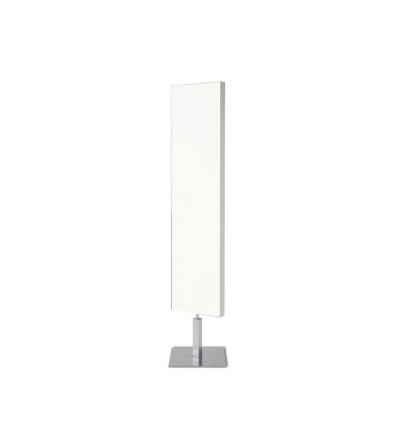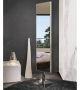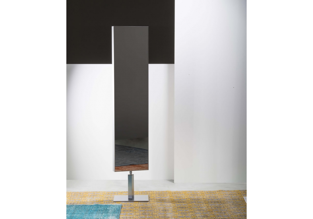 Voilà firmato da Riflessi è uno specchio girevole bifacciale da terra con base e struttura in acciaio satinato o verniciato grafite.