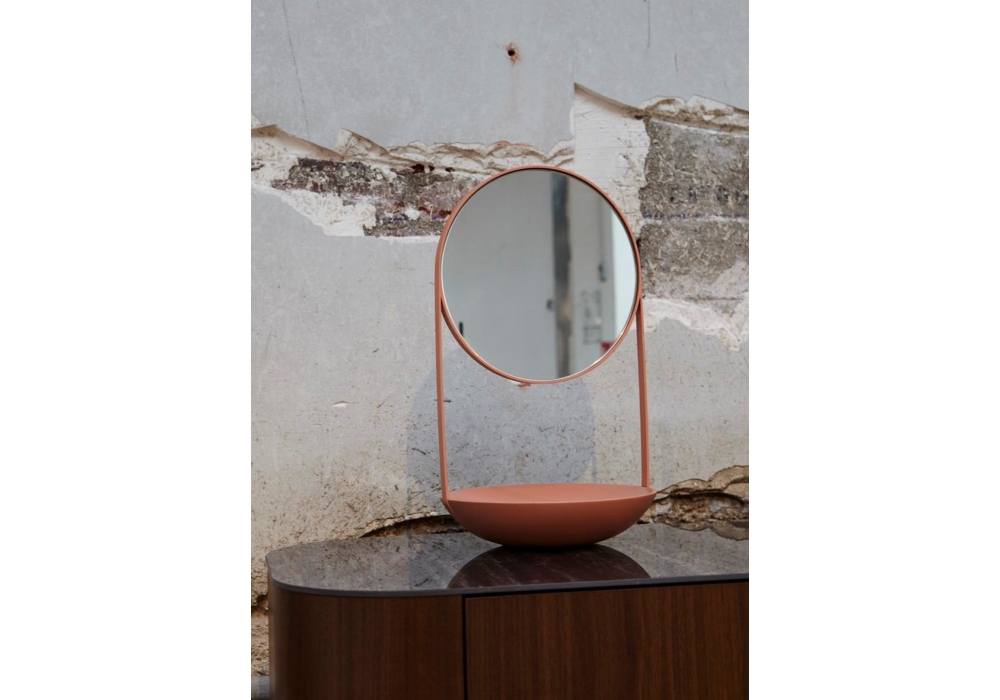 Nimbe firmato da Marie-Aurore Stiker Metral per Ligne Roset è uno specchio da tavolo con struttura in acciaio laccato rosa beige (RAL 3012). Vetro specchio (Ø 25 cm) con retro in lastra di acciaio laccata rosa beige e vaschetta portaoggetti in poliuretano sagomato laccato rosa beige. Finitura satinata.