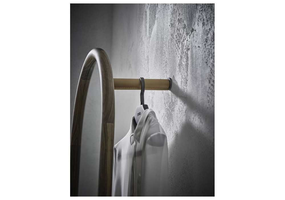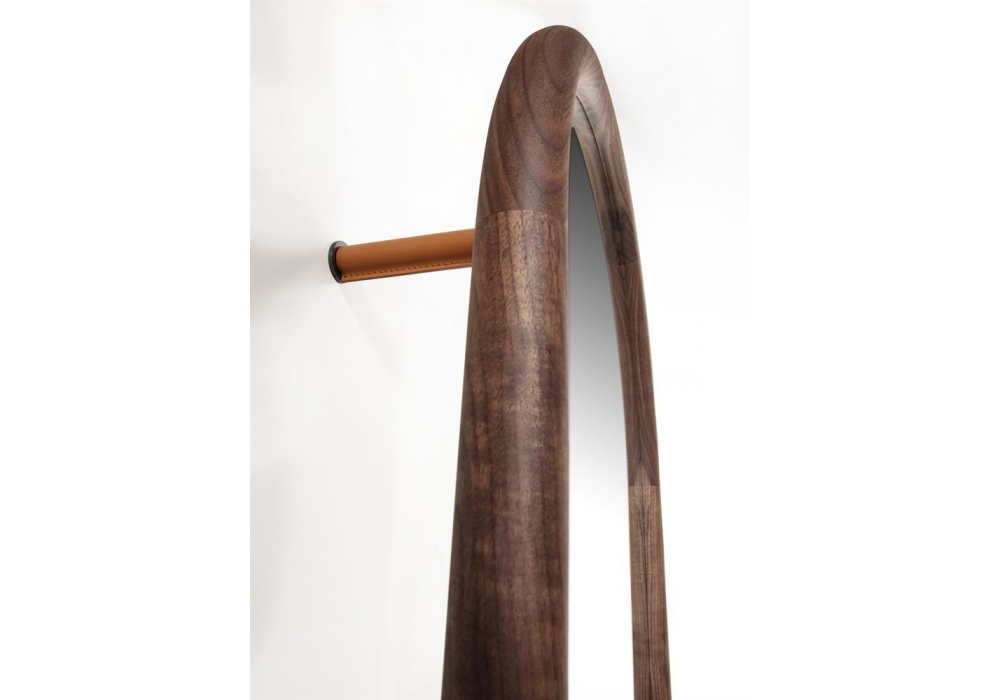 Backstage firmato da Nava & Arosio per Porada è uno specchio da parete con cornice in massello di noce canaletta. Sul retro dello specchio sono presenti un ripiano svuotatasche in noce canaletta e una barra appenderia rivestita in Cuoietto.
