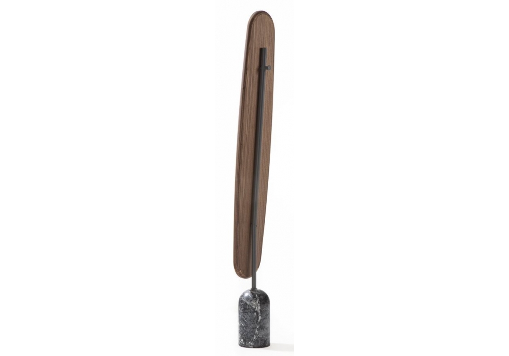 Ekero firmato da Tollgard & Castellani per Porada è un specchio realizzato con base cilindrica in marmo, stelo centrale in metallo verniciato e cornice in massello di noce canaletta.