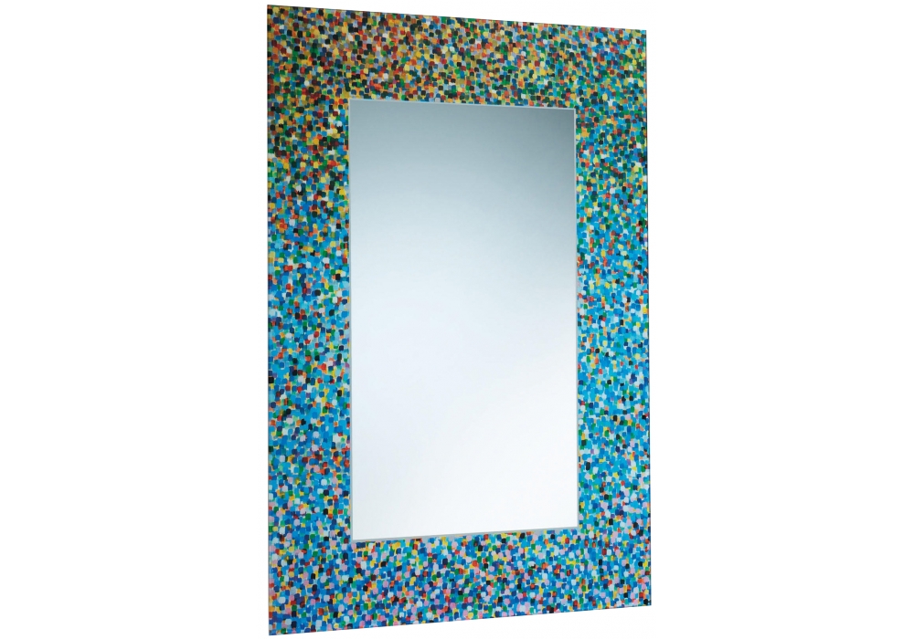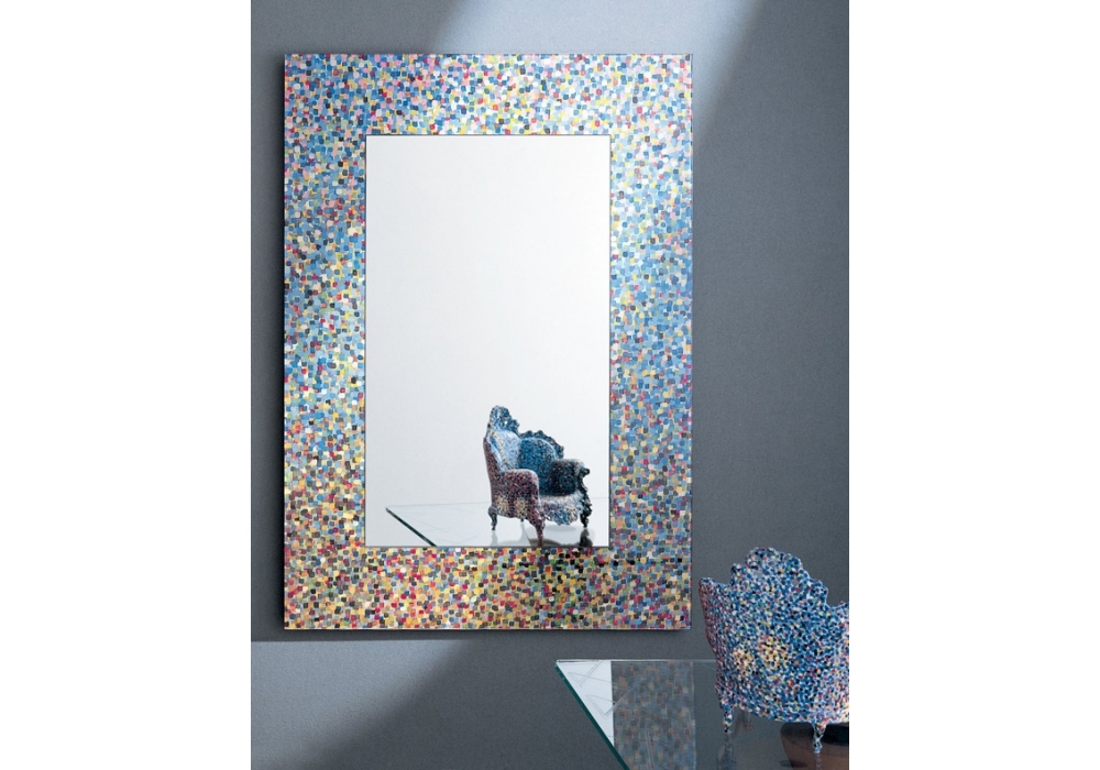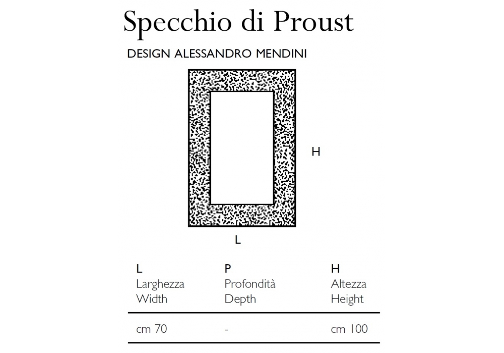 Specchio di Proust firmato da Alessandro Mendini per Glas Italia è uno specchio di forma rettangolare con una cornice policroma caratterizzata da una texture di segni a punta di pennello. É dotato di doppi attacchi orizzontali e verticali.