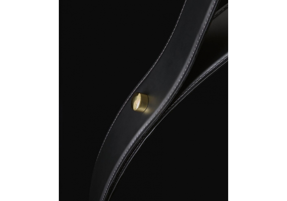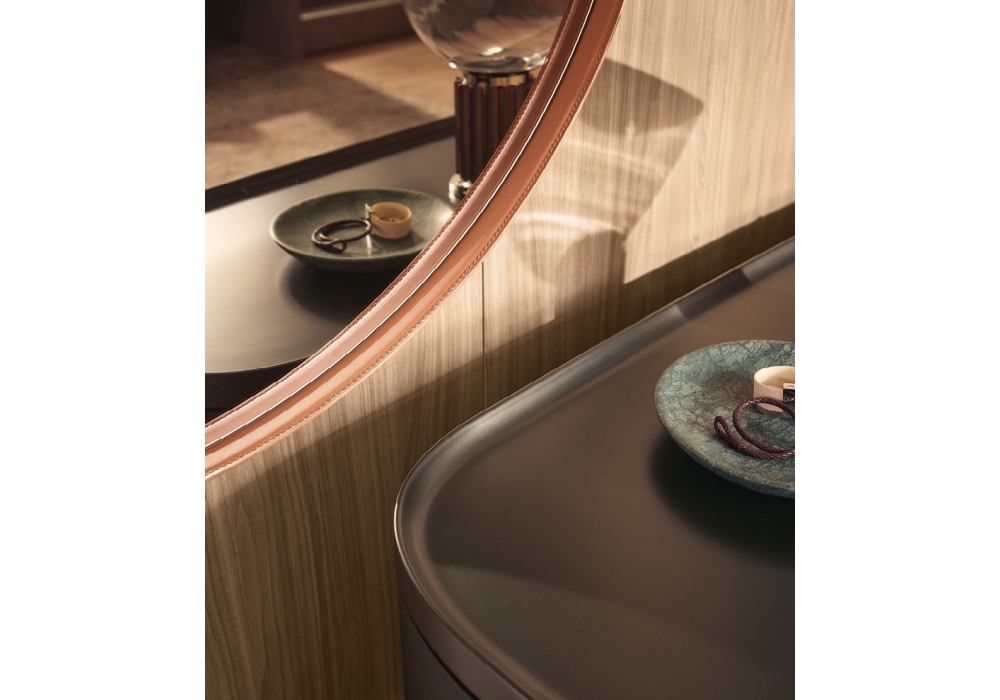 Drop firmato da R&D Poliform è uno specchio circolare con struttura in metallo rivestito in cuoio e specchio bronzato.