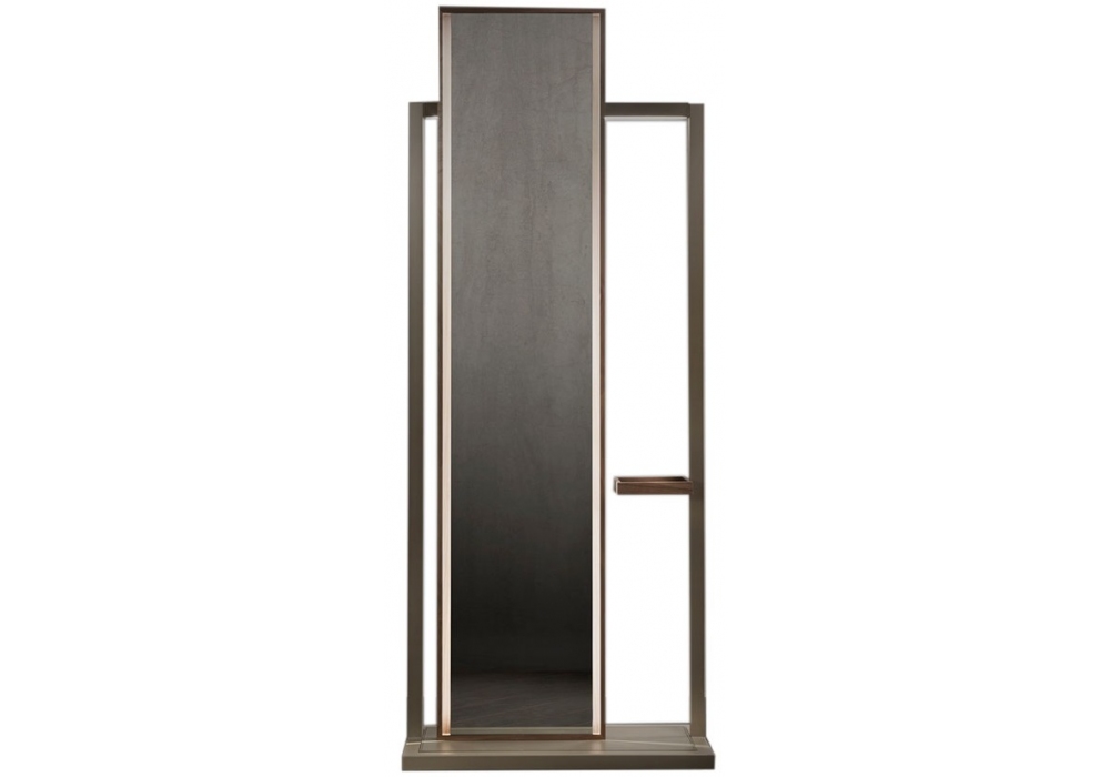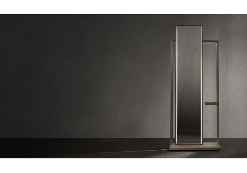 Continuum firmato da Matteo Nunziati per Natevo è uno specchio / servomuto da terra con illuminazione a LED. E' realizzata in rovere caffè o noce Canaletto Rialto con struttura in acciaio anodic bronze o gris sablé. Disponibile in due configurazioni: la prima ha una serie di cassettini sovrapposti verticalmente; il secondo comprende un appendiabiti e un piccolo vassoio.