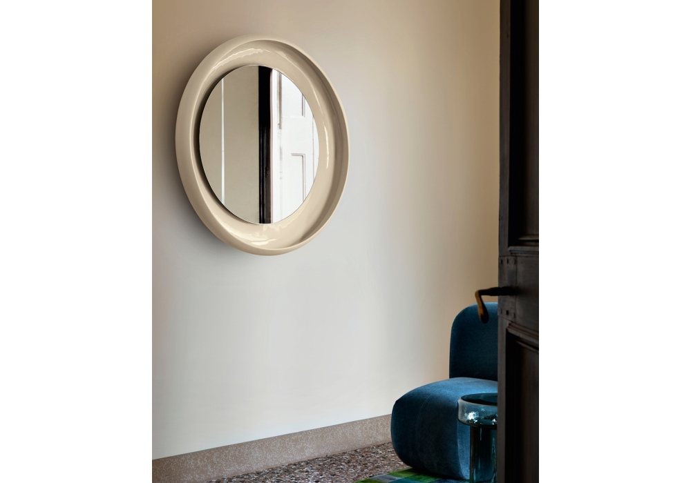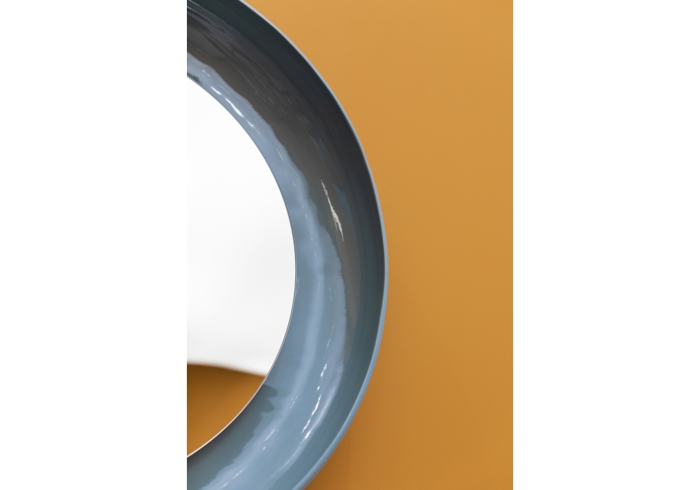 Coque firmato da Alain Gilles per Miniforms è uno specchio rotondo con cornice interna in ceramica smaltata e cornice esterna in ceramica opaca. È disponibile in due dimensioni e in diverse finiture.