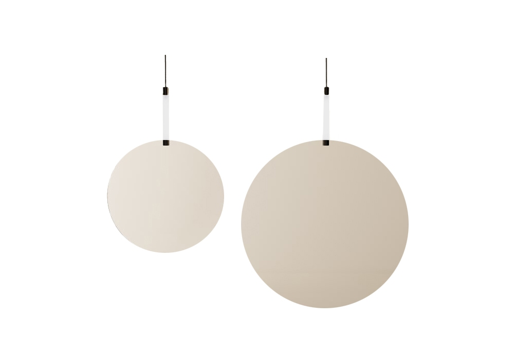 Faro firmato da Benedini Associati per Agape è uno specchio con luce. L'elemento di sostegno funge anche da lampada con luce LED; realizzato in policarbonato satinato con estremità in alluminio anodizzato nero. Lo specchio è sorretto da un cavo di acciaio predisposto pre restare distanziato dalla parete. Alimentatore nacosto nel rosone a soffitto.