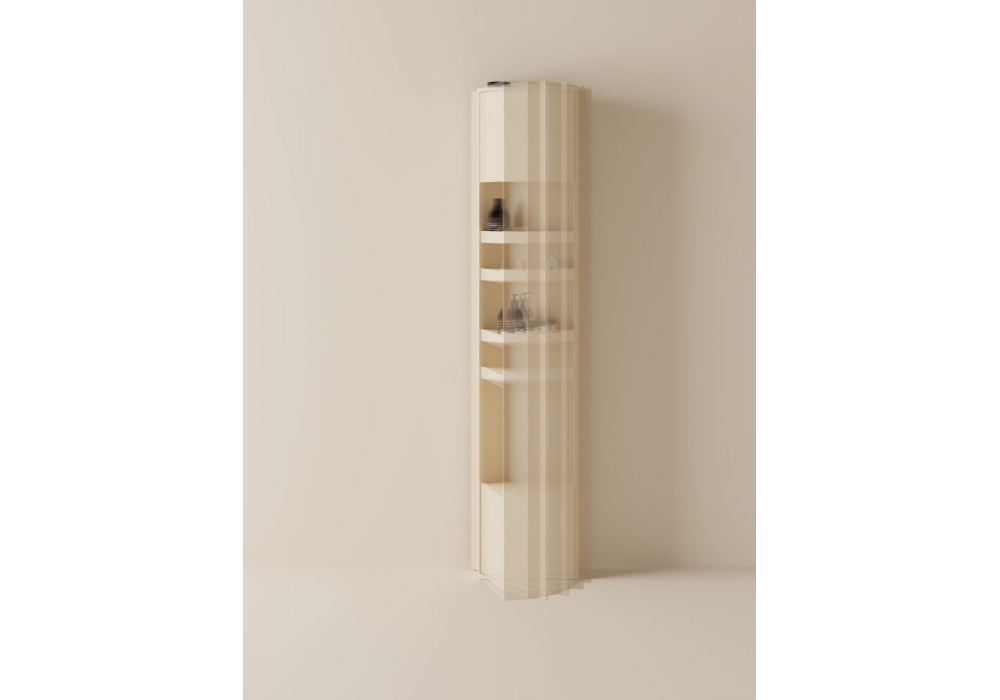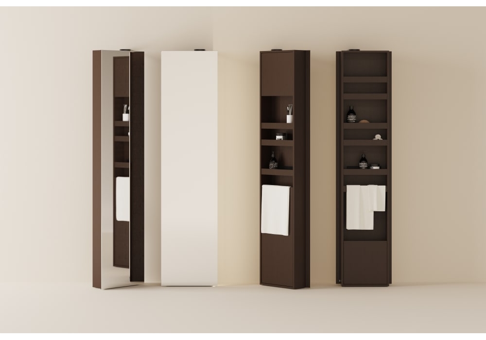 Voilà firmato da Alessandro Andreucci per Agape è uno specchio contenitore pivottante a destra o sinistra, realizzato in MDF con rivestimento in rovere in differenti finiture. Un lato è interamente a specchio e l'altro è attrezzato con contenitori, mensole, portasalviette. É possibile anche aggiungere una barra elettrificata o una fascia illuminante LEd verticale.