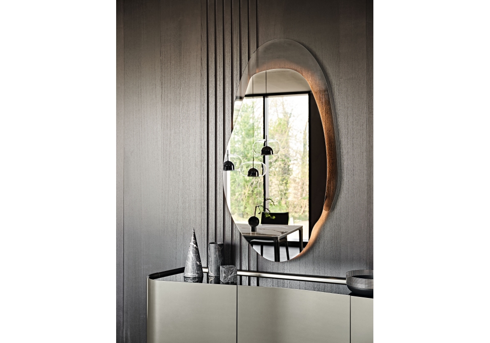 Akumal firmato da Paolo Cattelan per Cattelan Italia è uno specchio da parete realizzato in cristallo specchiato fumé con cornice in vetro fumé. Disponibile nella versione con luce LED.