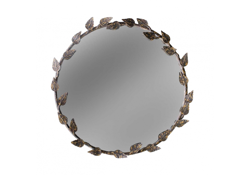 Aurelia Large prodotto e firmato da Porta Romana è uno specchio di forma circolare interamente strutturato in acciaio forgiato intagliato ed adornato a mano. La cornice metallica è decorata da molteplici applicazioni floreali e verniciata in un unica finitura rugine d'orata.