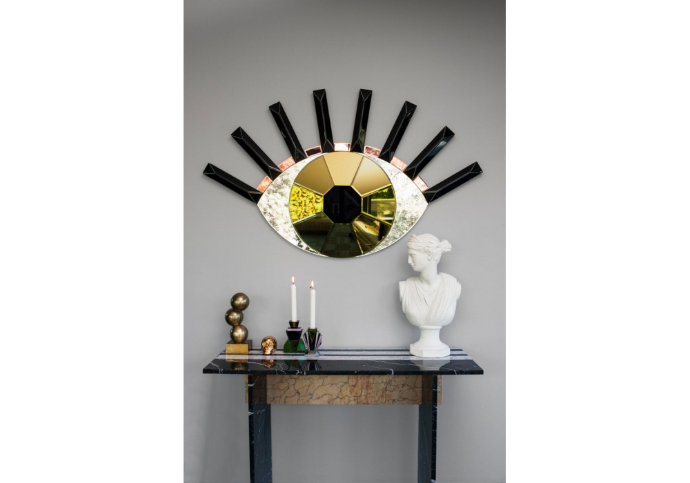 Eye Of The Tiger prodotto e firmato da Reflections Copenhagen è uno specchio di forma astratta in vetro applicato su base di supporto in MDF verniciato di nero. Lo caratteristica peculiare di questo specchio è la sua forma che ritrae un occhio composto da molteplici parti in vetro di differenti cromie e dimensioni tagliate ed assemblate a mano.