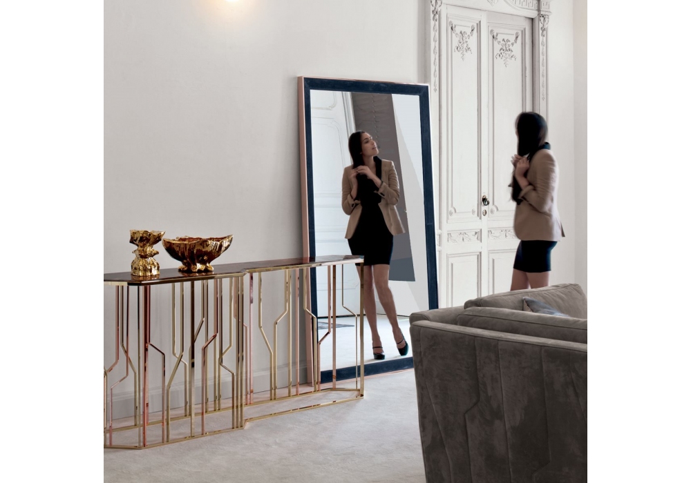 Nanami firmato da Silvia Musetti per Longhi è uno specchio con bordo in metallo in finitura lucida o opaca e cornice con rivestimento in pelle. Disponibile in differenti dimensioni.