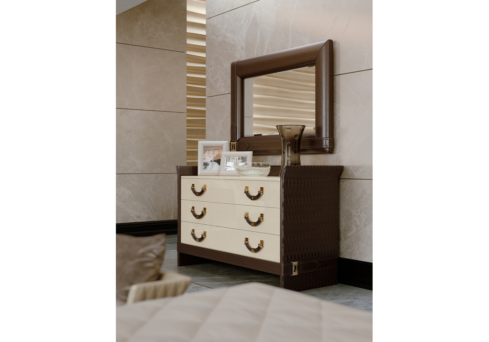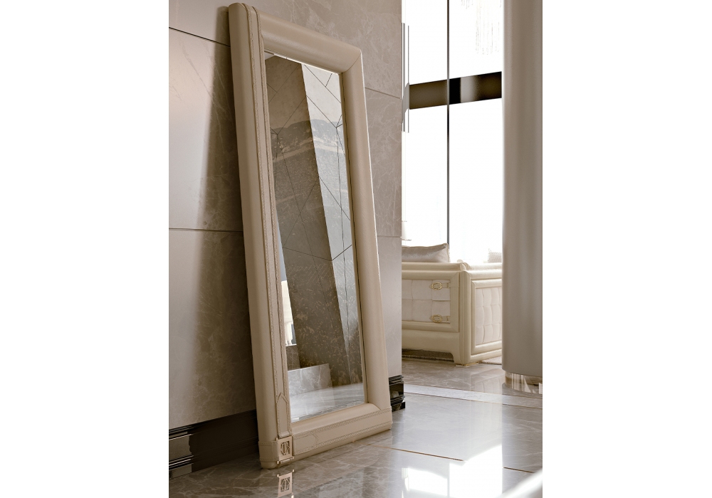 Numero Tre firmato da Roberto Serio per Turri è uno specchio con struttura in MDF con rivestimento in pelle con fibbie e passanti in metallo in finitura oro. Disponibile in diverse dimensioni e orientamenti.