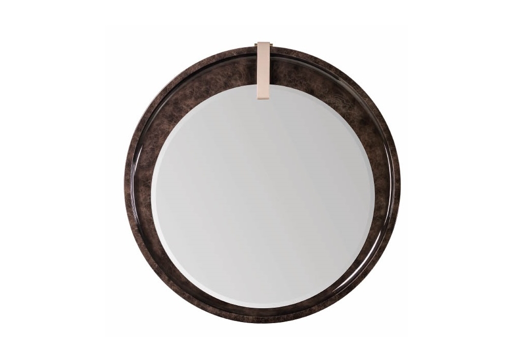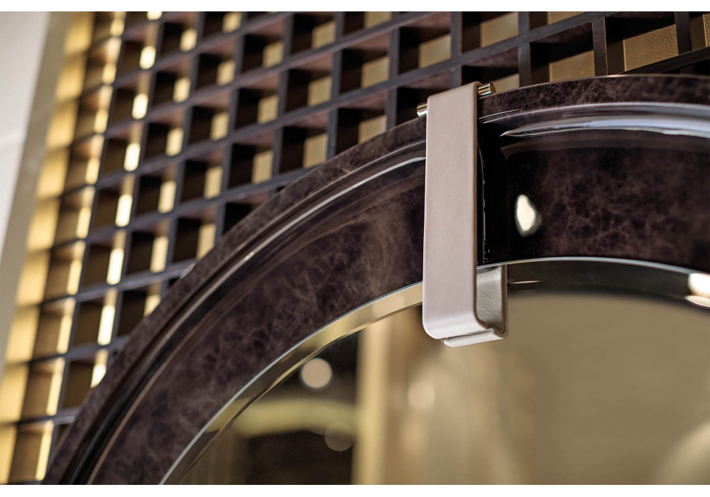 Eclipse firmato da Andrea Bonini per Turri è uno specchio rotondo con struttura in MDF in finitura laccata lucida. É presente un inserto realizzato in differenti pelli; sorretto da un elemento metallico dorato.