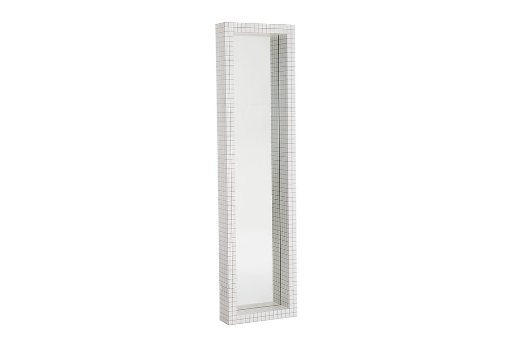 476 Quaderna firmato da Superstudio per Zanotta è uno specchio in cristallo con cornice in legno placcato laminato Print, colore bianco, a stampa digitale a quadretti neri.
