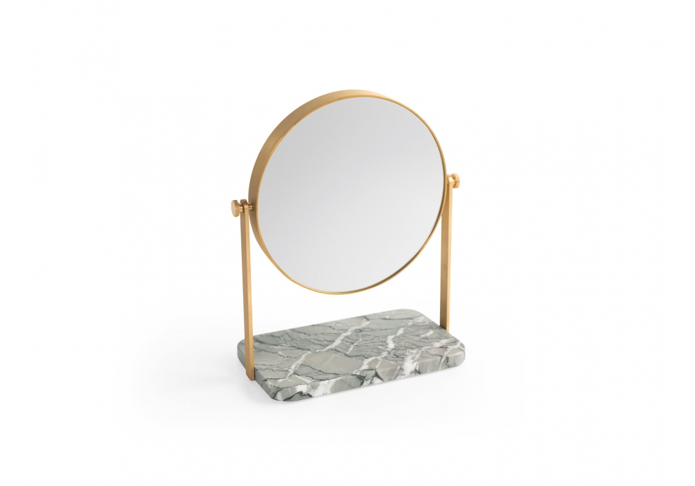 Regarde-moi firmato da Giuseppe Casarosa per Ceccotti Collezioni è uno specchio da tavolo girevole con struttura in ottone e base in marmo.