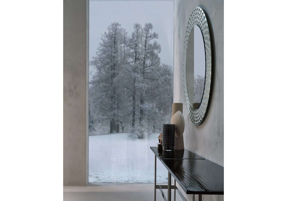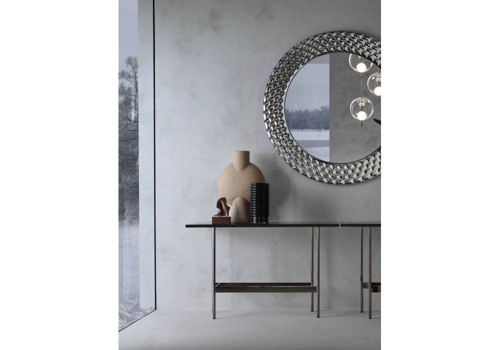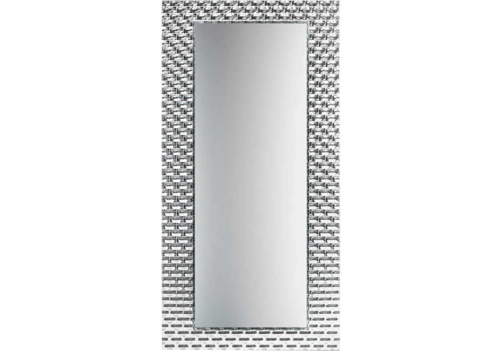 Pasha firmato da Dainelli Studio per Fiam è uno specchio caratterizzato da una cornice in vetro fuso a gran fuoco retroargentato con decoro a rilievo. Telaio posteriore in metallo verniciato.