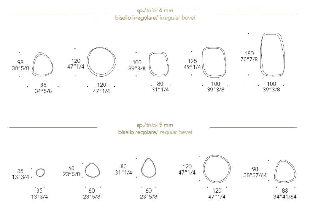 Seventy firmato da Reflex Angelo è uno specchio in vetro extrachiaro con forme irregolari, disponibili con bisellatura regolare o irregolare. Abbinabile al Seventy Vetromarmo.