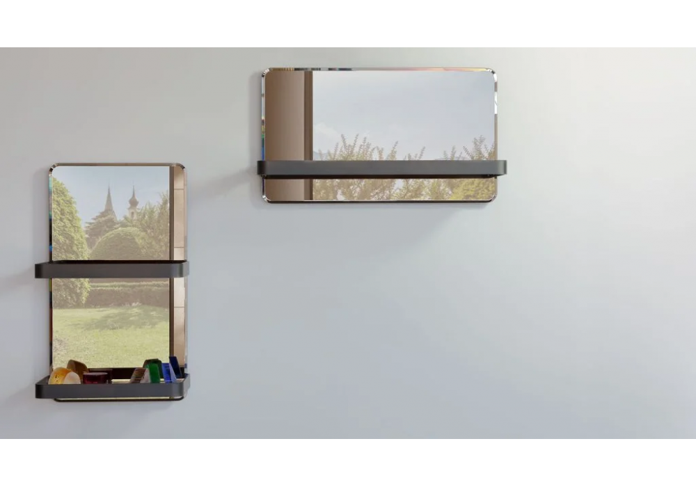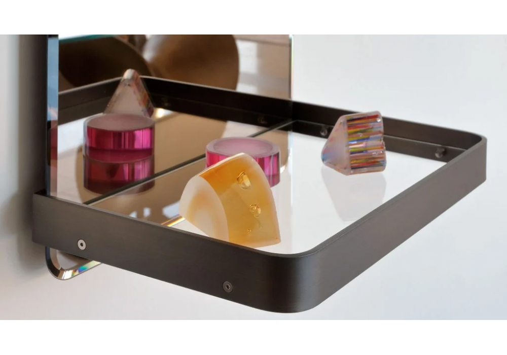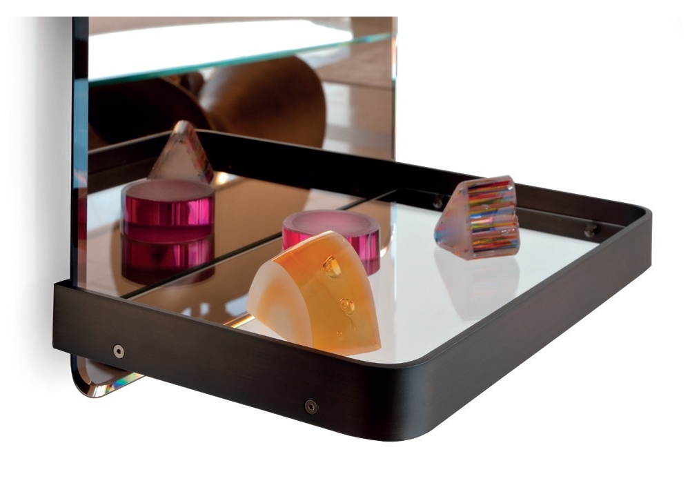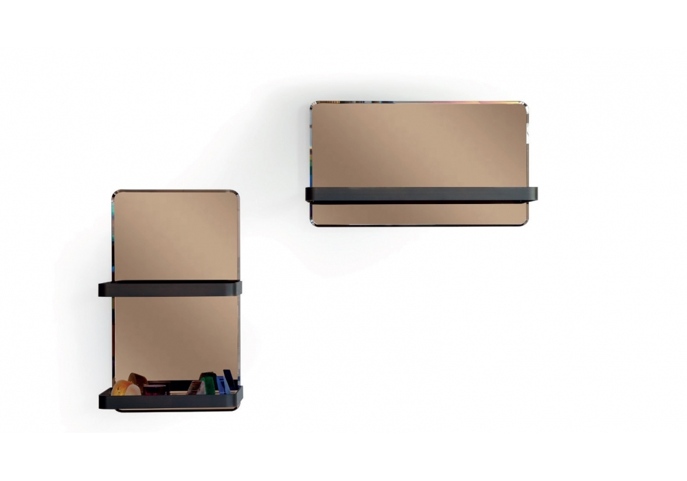 Shelf firmato da Tulczinsky per Reflex Angelo è uno specchio in vetro bronzo con mensola in vetro trasparente con supporto in metallo finitura Bronze.