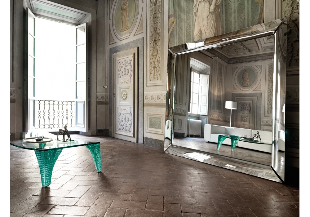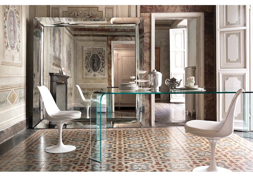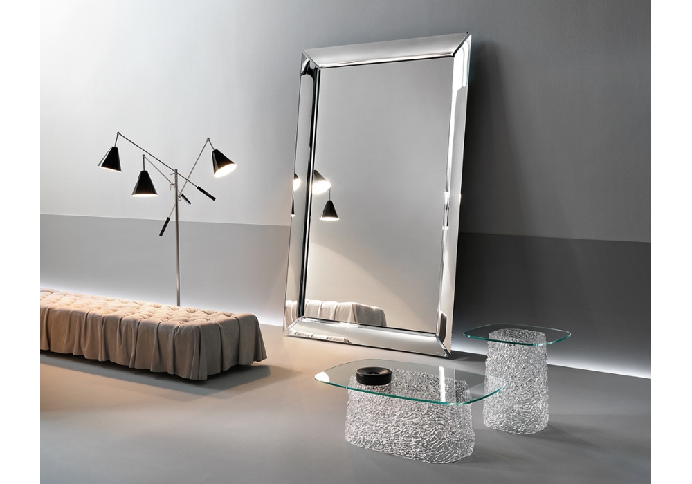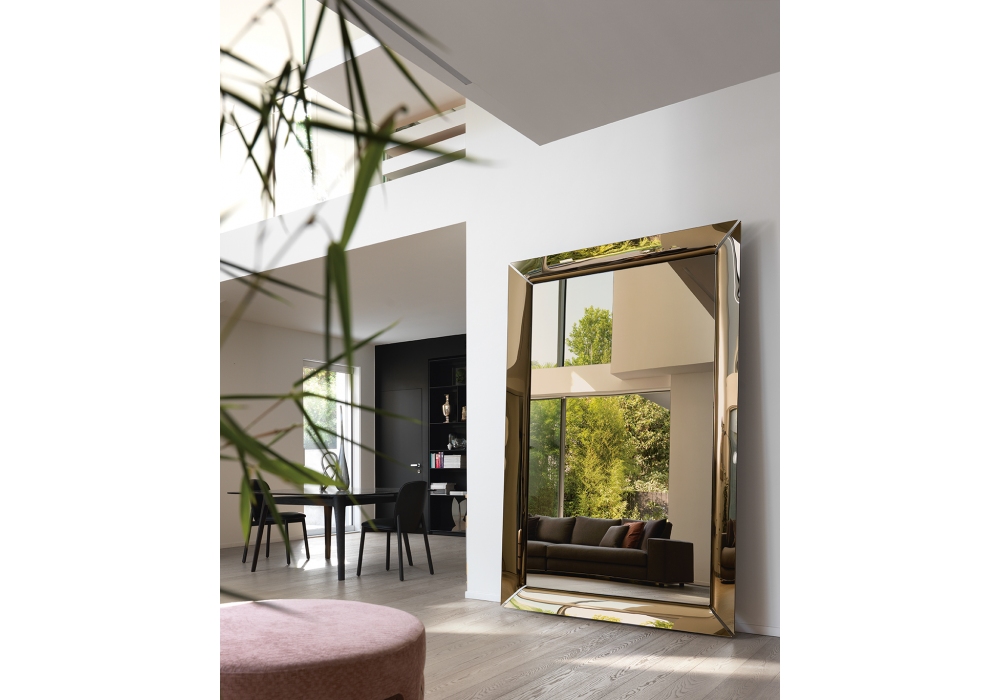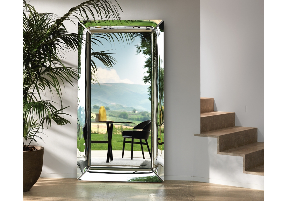 Caadre firmato da Philippe Starck per Fiam è uno specchio autoportante con cornice composta da quattro elementi curvi con finitura argentata sul retro. Disponibile in vetro semiriflettente color Titanio o in vetro bronzo retroargentato. Disponibile con kit di illuminazione a LED con dimmer e regolazione della temperatura.