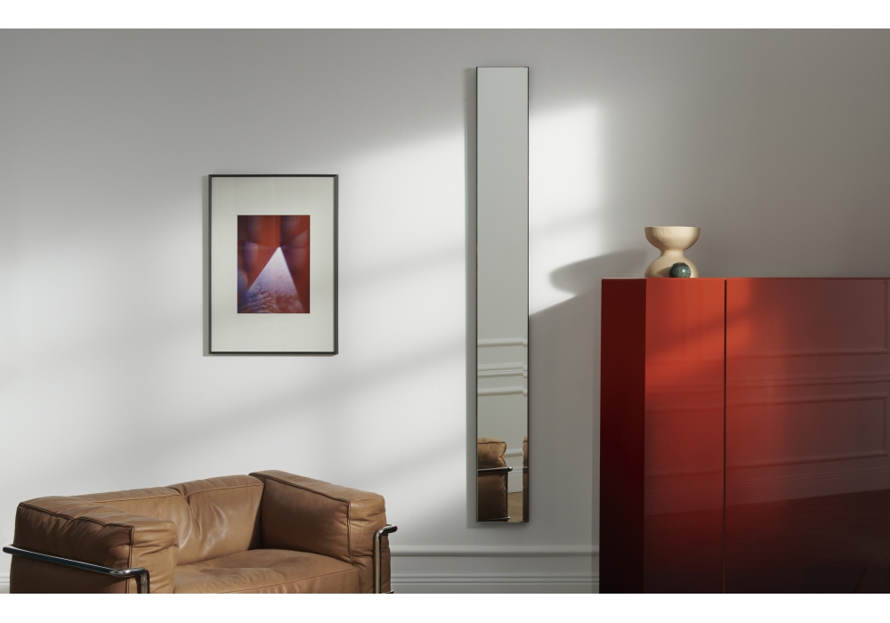 Otero firmato da Studio Simon per Cassina è uno specchio realizzato in vetro float chiaro molato e supporto verniciato poliestere con finitura lucida specchiante.