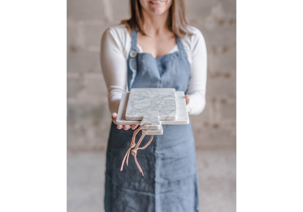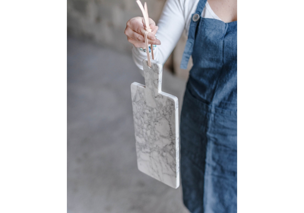 Ci Penso Io - Tagliere Piccolo firmato da MarmoLove è un tagliere rettangolare piccolo realizzato in marmo e laccio in cuoio.