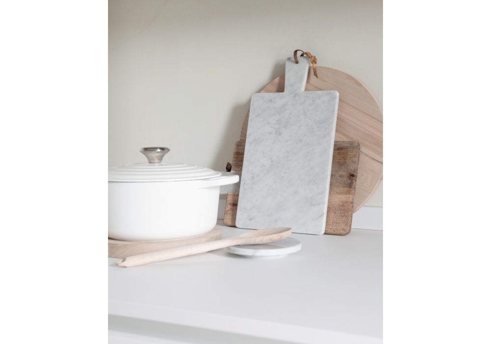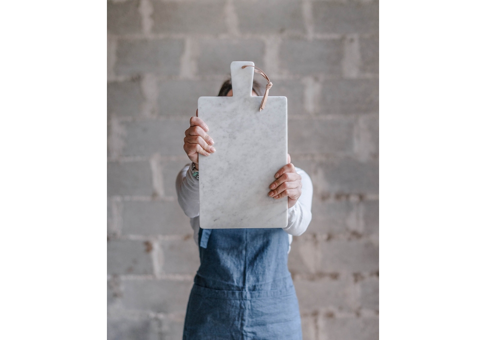 Ci Penso Io - Tagliere Grande firmato da MarmoLove è un tagliere rettangolare grande realizzato in Marmo Bianco di Carrara levigato e laccio in cuoio.