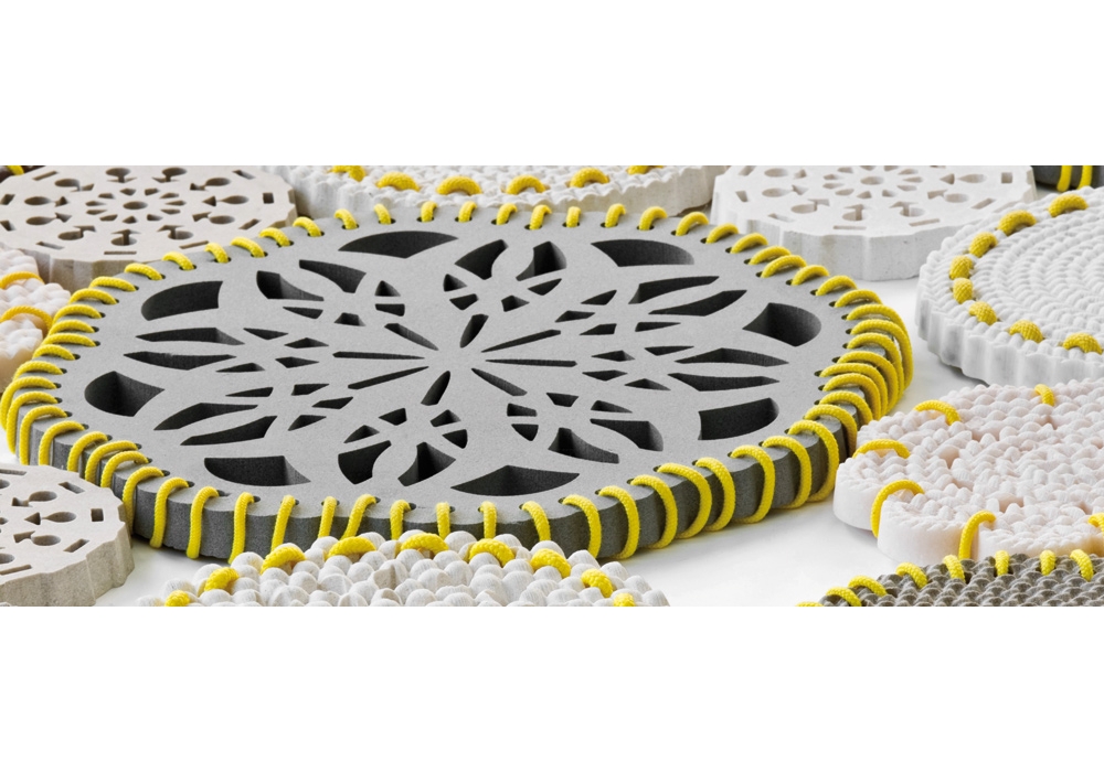 Nat|f|Use firmato da Patricia Urquiola per Budri è un tappeto composto da merletti in marmo e pietra calcarea tenuti insieme da una fascia gialla fluo. Disponibile anche in 2 dimensioni.