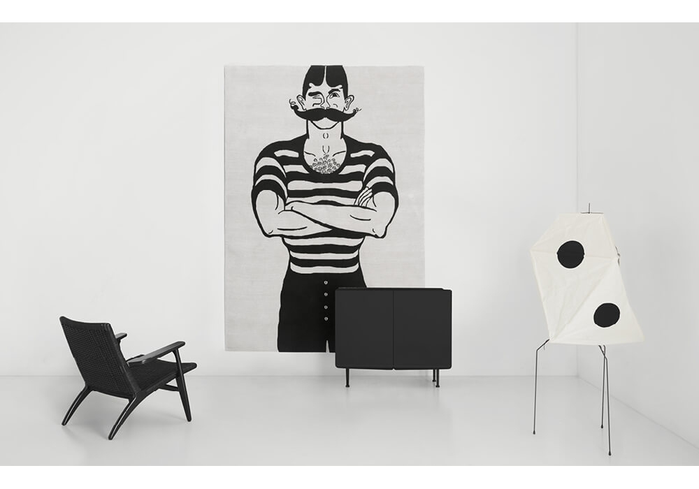 Man firmato da René Gruau per Amini è un tappeto annodato a mano 100% lana Neozelandese con frange rivoltate sul retro e coperte da tessuto.