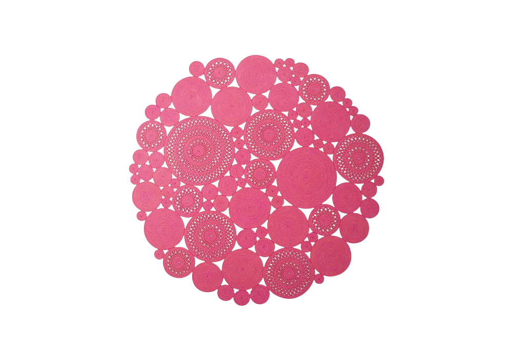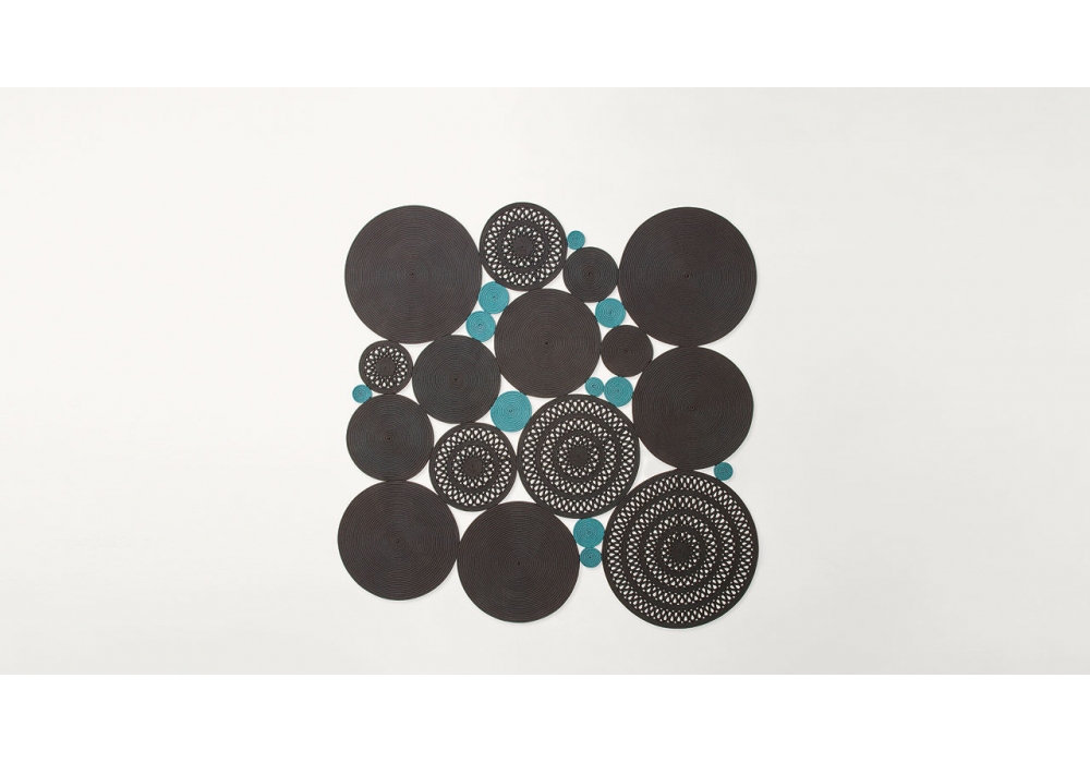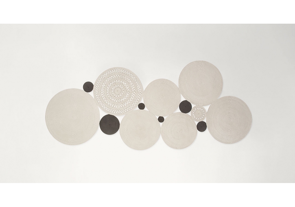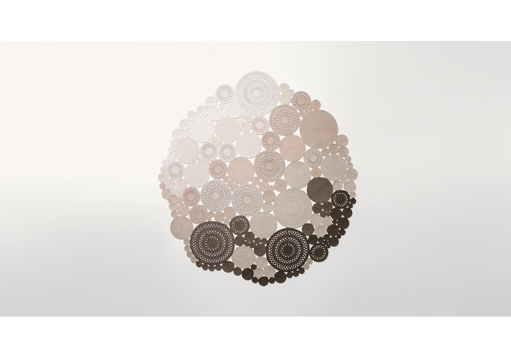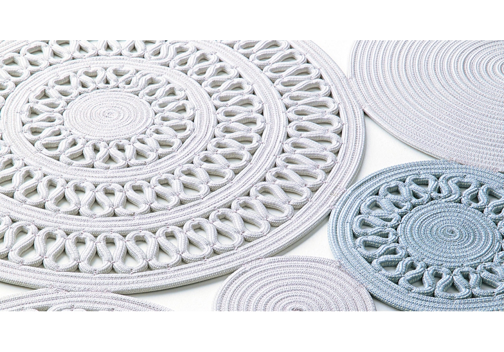 Cosmo firmato e prodotto da Paola Lenti è un tappeto per esterni e interni realizzato in corda, con motivi realizzati a mano che ne costituiscono la superficie. Attraverso gli spazi lasciati liberi dal sistema di cerchi e spirali si intravede il pavimento. Disponibile in 2 dimensioni.
