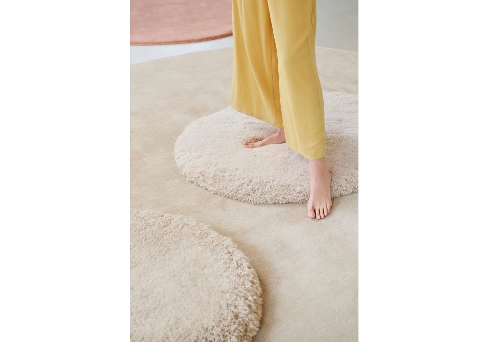Ciclopi - Atollo firmata da Elisa Ossino per Amini è una collezione di piccoli tappeti realizzati in lana organica; annodati a mano. Disponibile in diverse finiture.