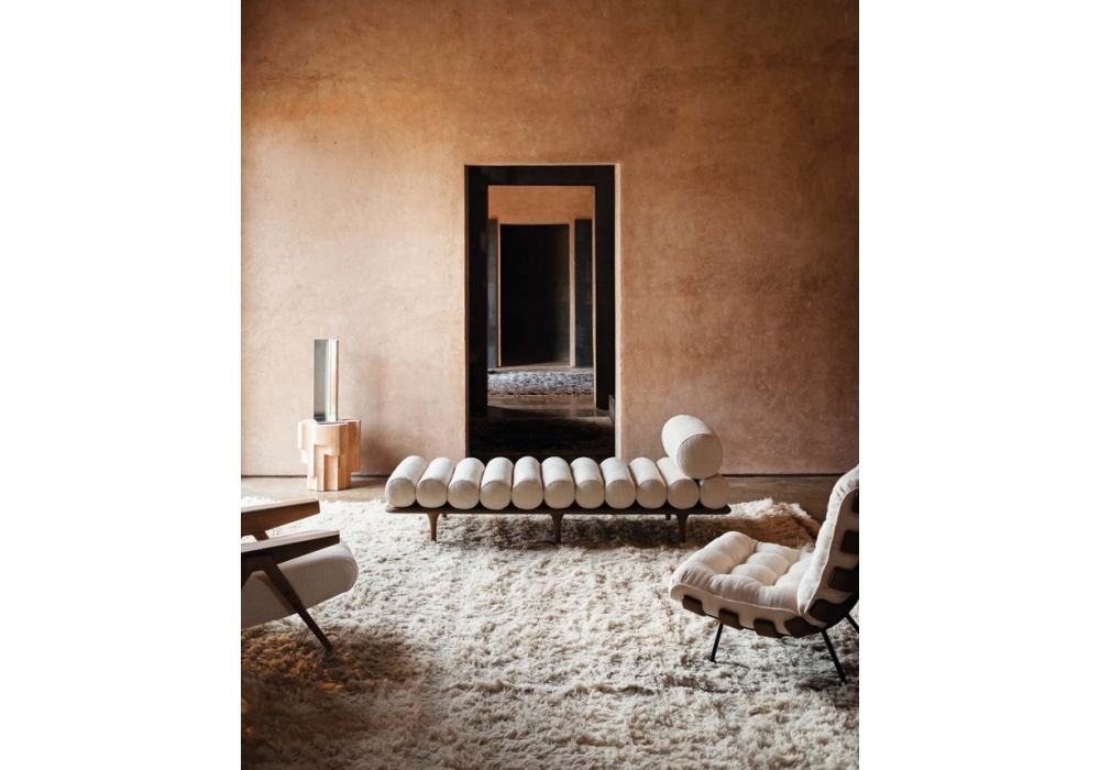 Kuschel firmato da Salem van der Swaagh per Tacchini è un tappeto realizzato in lana naturale e seta. La trama si compone di fili intrecciati e annodati a mano e di frange dalle tonalità calde.