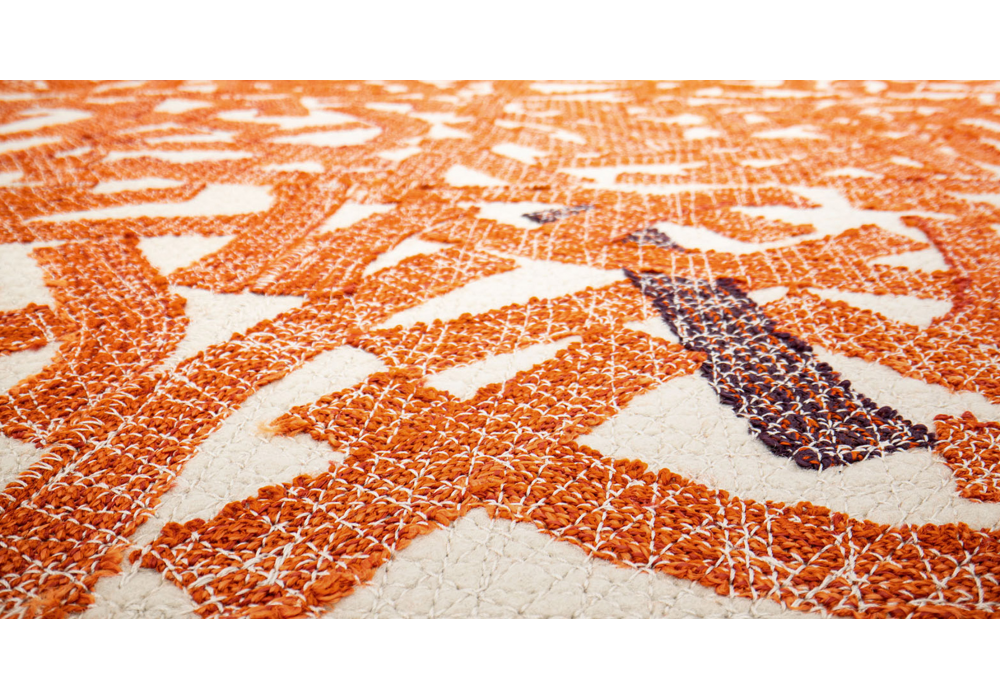 Dedalo firmato da CRS per Paola Lenti è un tappeto modulare realizzato cucendo fra loro a punto Zigzag elementi in feltro di lana di 30 x 30 cm ciascuno. Ogni elemento viene prima decorato con un numero variabile di corde di lana e successivamente ricamato a macchina con un filo di un unico colore, a formare un fitto intreccio. Cucitura perimetrale a punto Pettine.