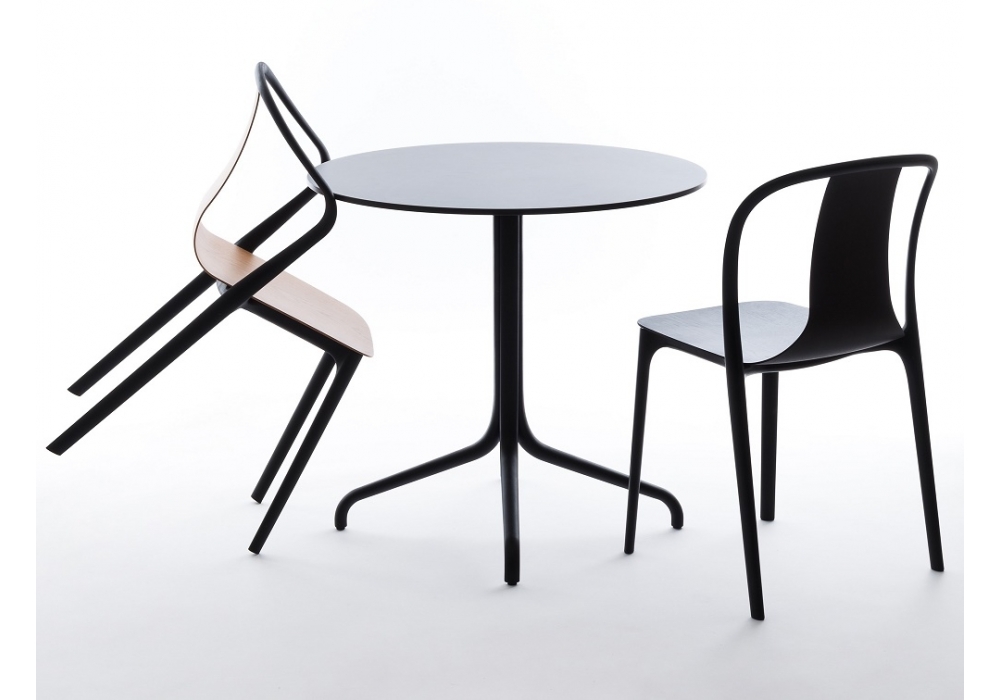 Il colore e la texture superficiale delle gambe dei tavoli in alluminio pressofuso con finitura verniciata a polvere in colore nero sono quasi indistinguibili dal telaio in poliammide della Belleville Chair. E dato che i materiali dei top e delle scocche sono identici o armoniosamente coordinati, i tavoli e le sedie formano un gruppo unitario ma sempre diverso – una famiglia ibrida di arredi, la cui materialità si sottrae a qualsiasi classificazione.