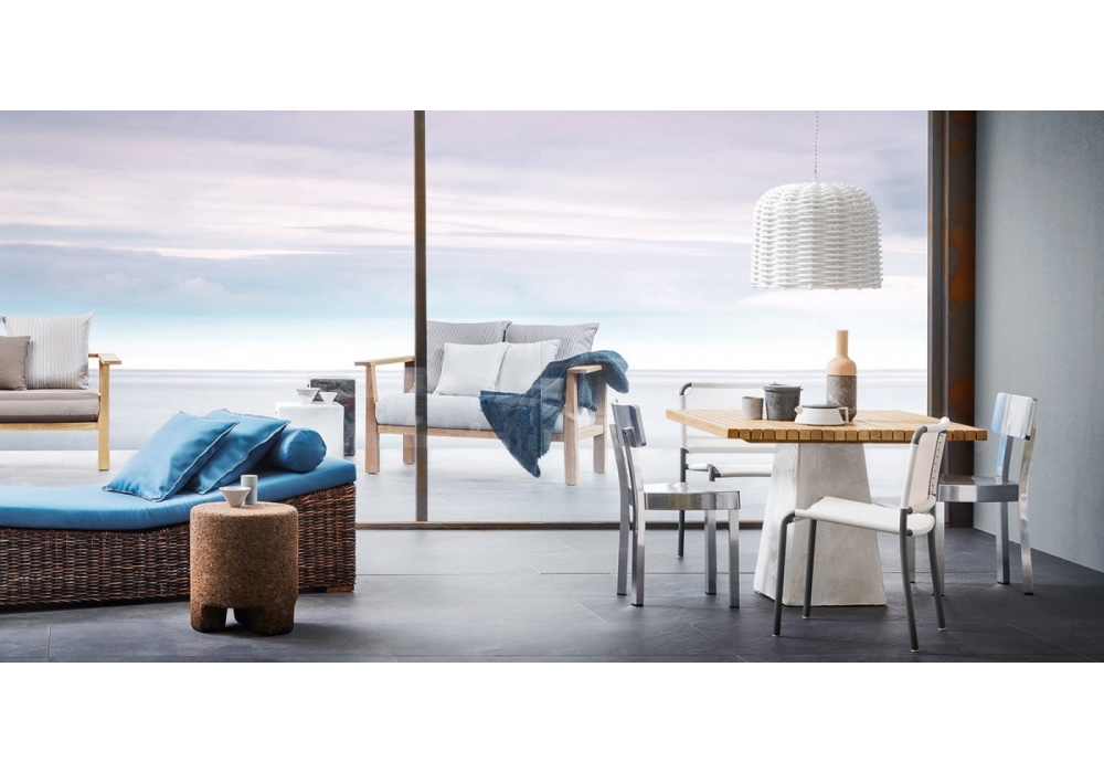 InOut 35 firmato da Paola Navone per Gervasoni è un tavolo con piano a doghe di teak, base centrale in cemento GFRC. Disponibile in diverse finiture.