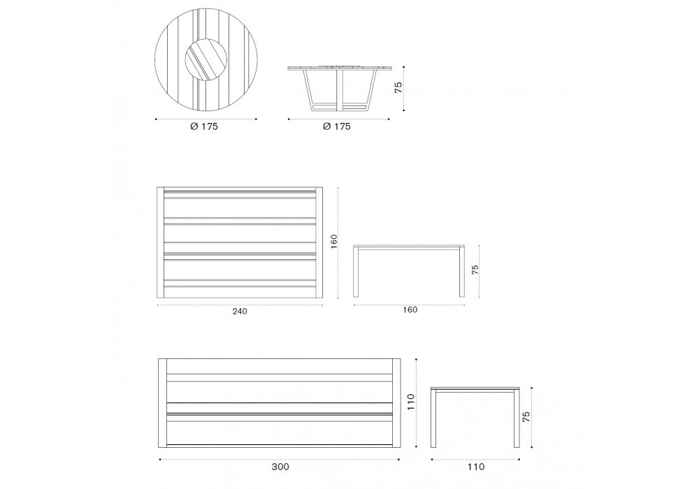 | Dimensioni | Ø 175 x H 75 cm; 240 x 160 x H 75 cm; 300 x 110 x H 75 cm; |