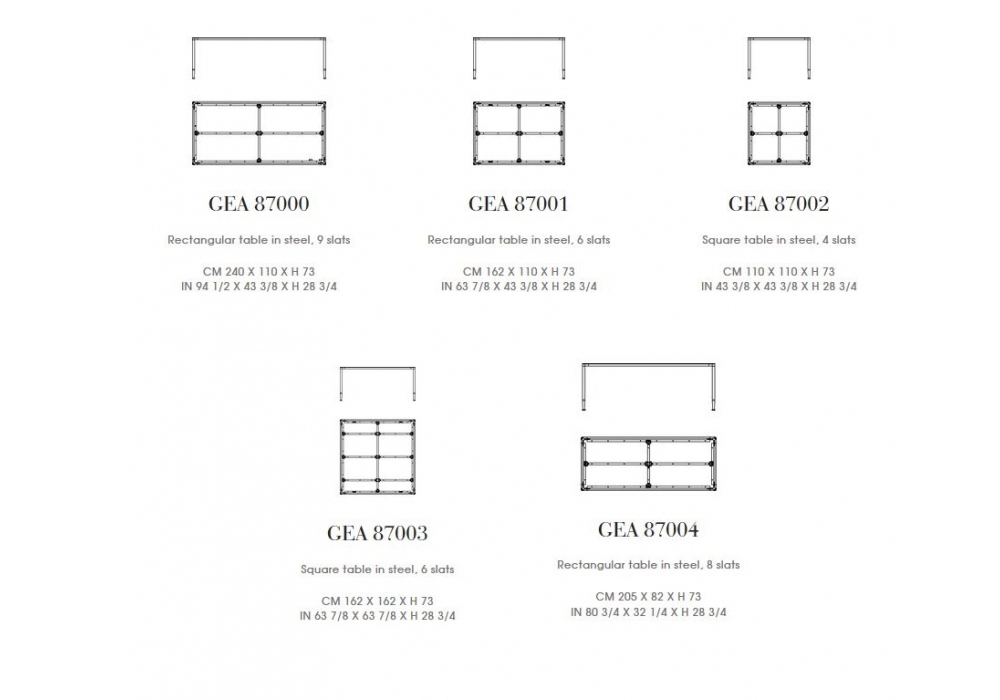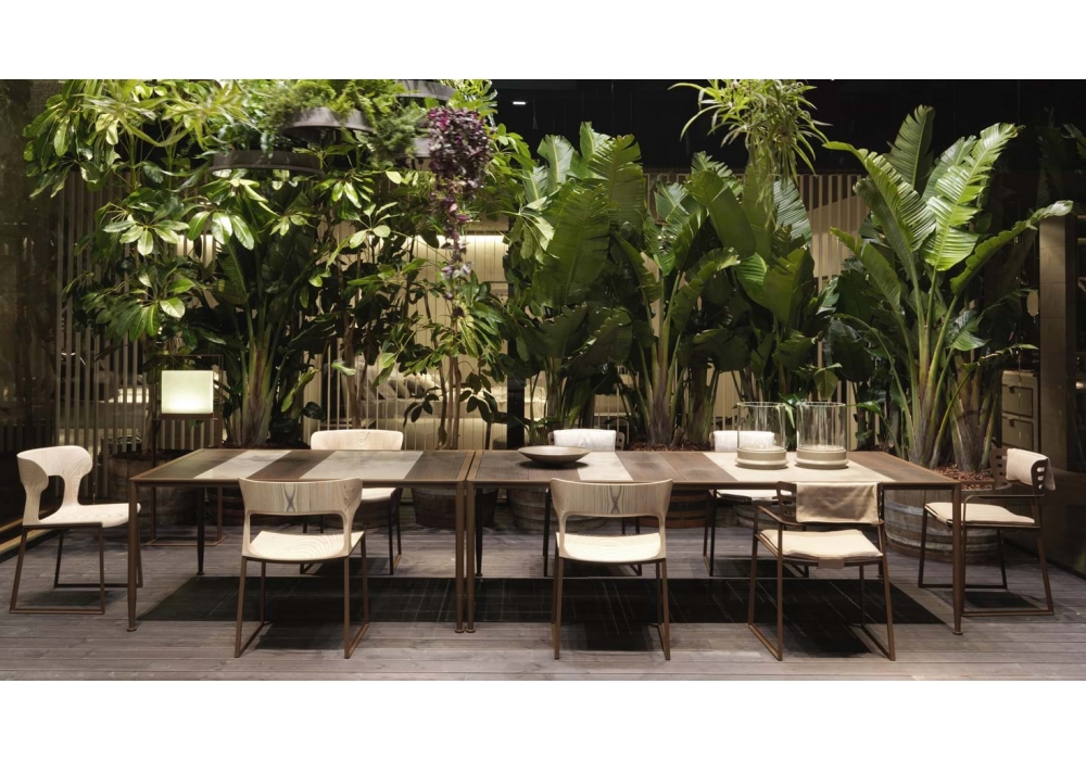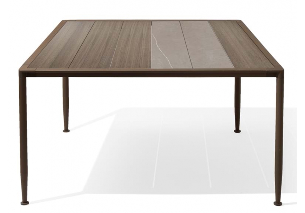 Gea firmato da Chi Wing Lo per Giorgetti è un tavolo da esterni con struttura in acciaio inox protetto verniciato a polvere color carruba. Piano con doghe in rovere abonos, afrormosia e marmo grigio oriente spazzolato configurabili a piacere. Disponibile in diverse dimensioni.