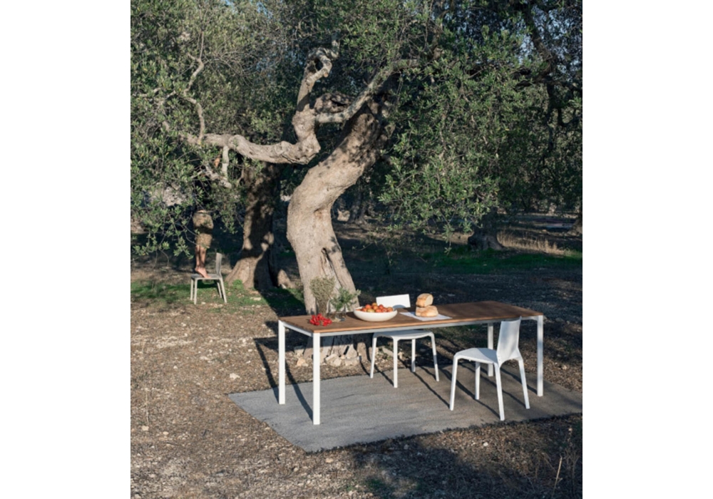 Be-Easy Slatted firmato da Bluezone per Kristalia è un tavolo per esterni con gambe in acciaio e piano a doghe in alluminio o teak. Disponibile in diverse finiture e dimensioni.