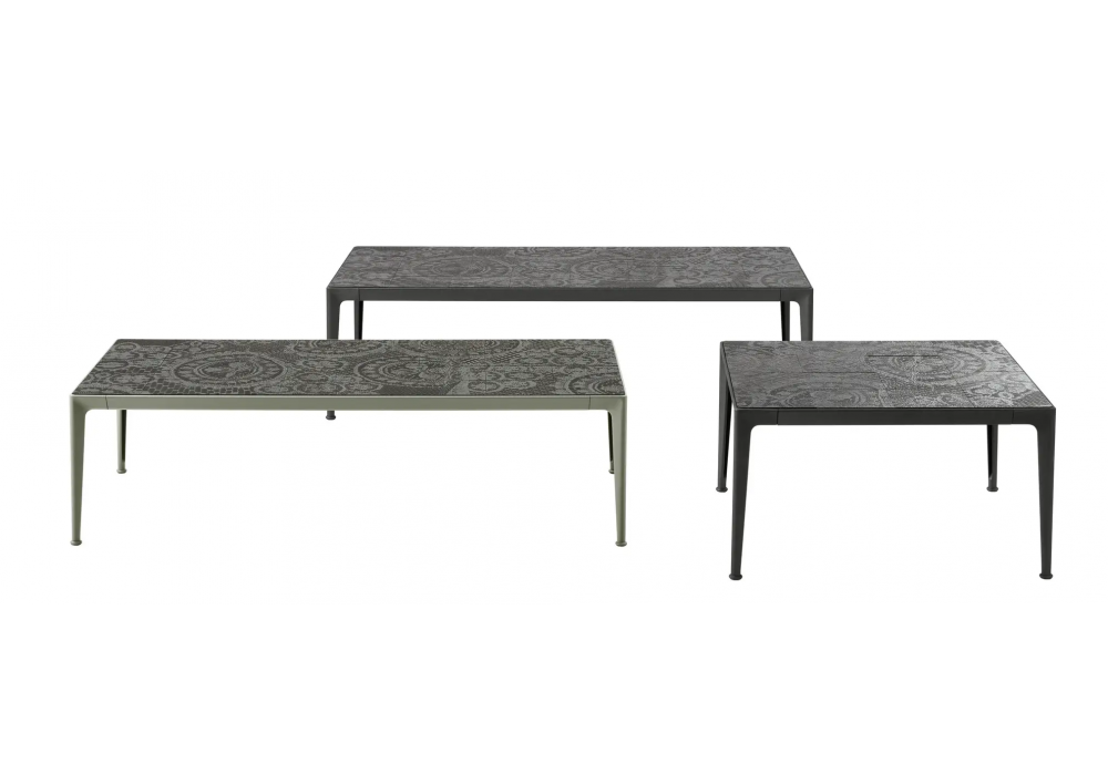 Mirto firmato da Antonio Citterio per B&B Italia Outdoor è un tavolo con struttura in alluminio verniciato e piano in pietra lavica con decoro in differenti finiture.