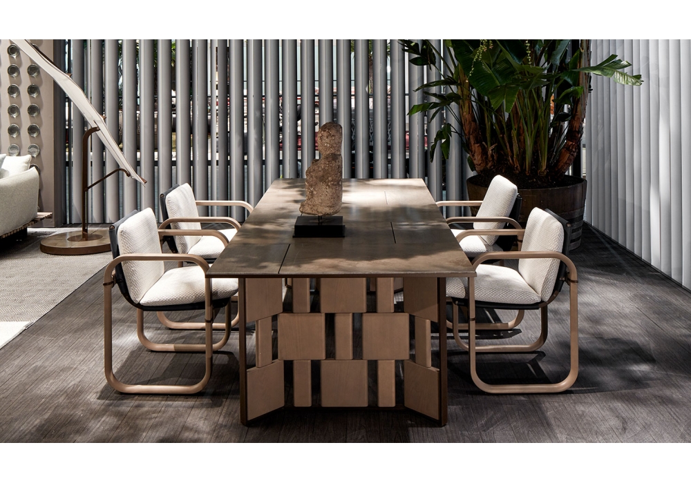 Break firmato da Ludovica & Roberto Palomba per Giorgetti è un tavolo con struttura in alluminio e acciaio inox protetto, verniciato a polvere color carruba. Le gambe hanno inserti in frassino disponibile in finitura sabbia (fin.3F) e il piano è formato da inserti in marmo grigio oriente spazzolato. Disponible in 2 dimensioni.