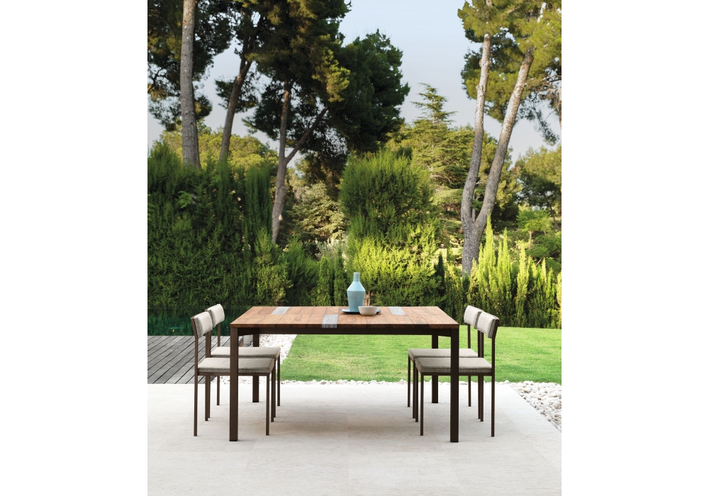 Casilda è un tavolo disegnato da Ràmon Esteve per Talenti. Struttura in acciaio inox verniciato a polvere e con top in legno iroko. Tavolo da esterni resistente alle interperie e con listelli in pietra travertino, disponibile in diverse colorazioni e dimensioni.