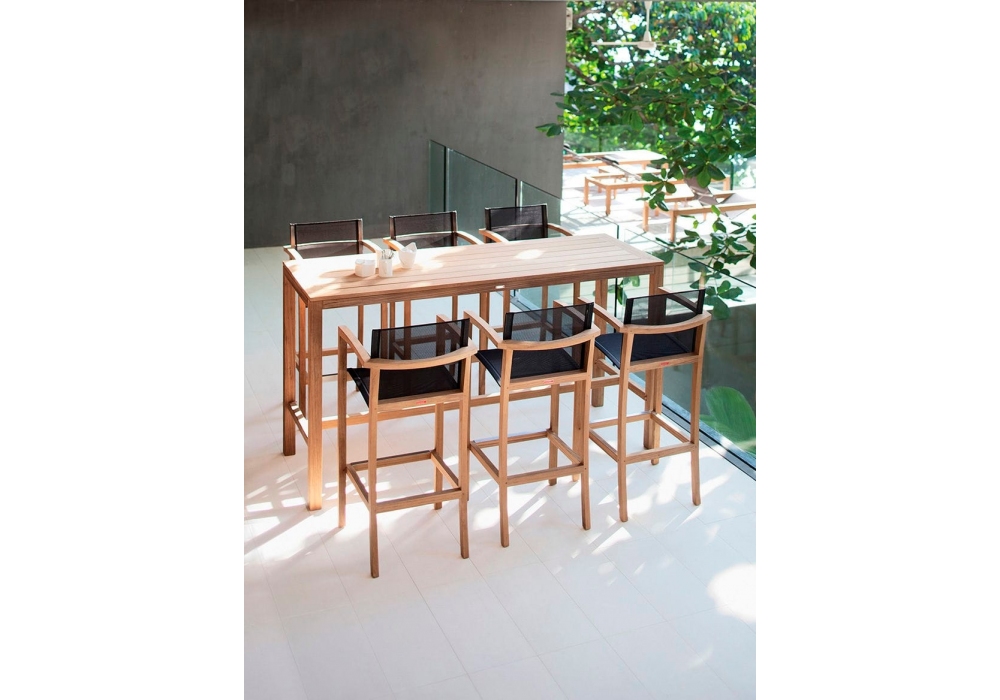 XQT firmato da Kris Van Puyvelde per Royal Botania è un tavolo bar con struttura e piano realizzati in teak.