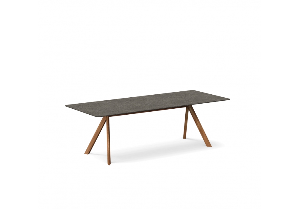Atrivm Outdoor firmato da Manel Molina per Expormim è un tavolo da pranzo rettangolare con struttura e gambe realizzate in profilo di alluminio ad alta resistenza, rifinito con polvere di poliestere o legno sapele certificato FSC® C164846. Piano disponibile in HPL o Dekton.