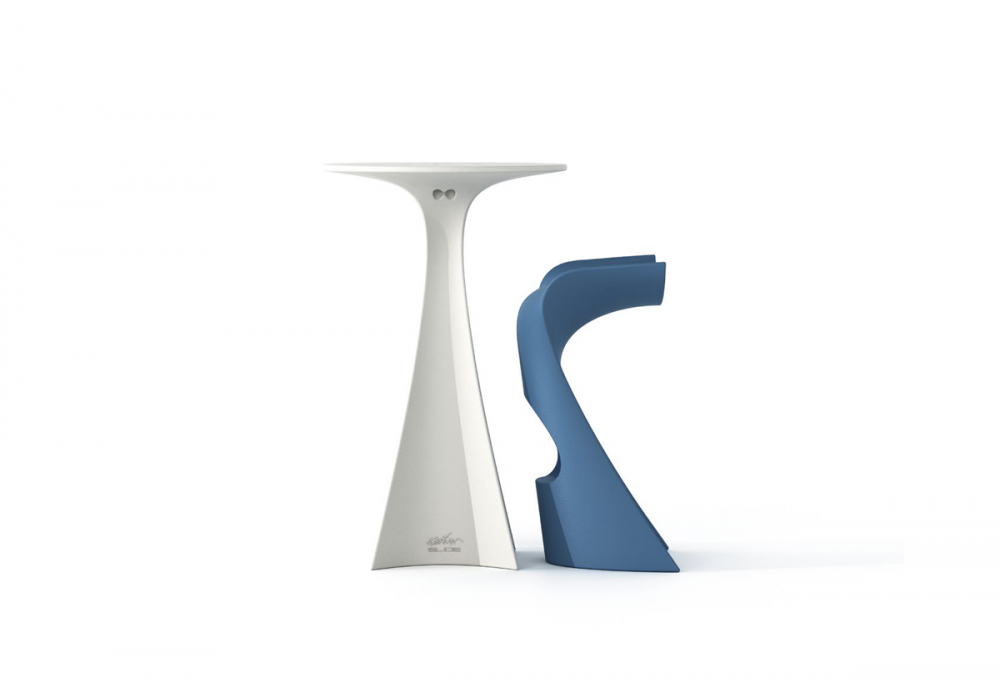 Jet firmato da Karim Rashid per Slide è un tavolo la cui base curvilinea accentua la silhouette dello sgabello fino a fondersi con esso, il top è decorato con simboli storicamente cari al designer. Disponibile in diverse finiture