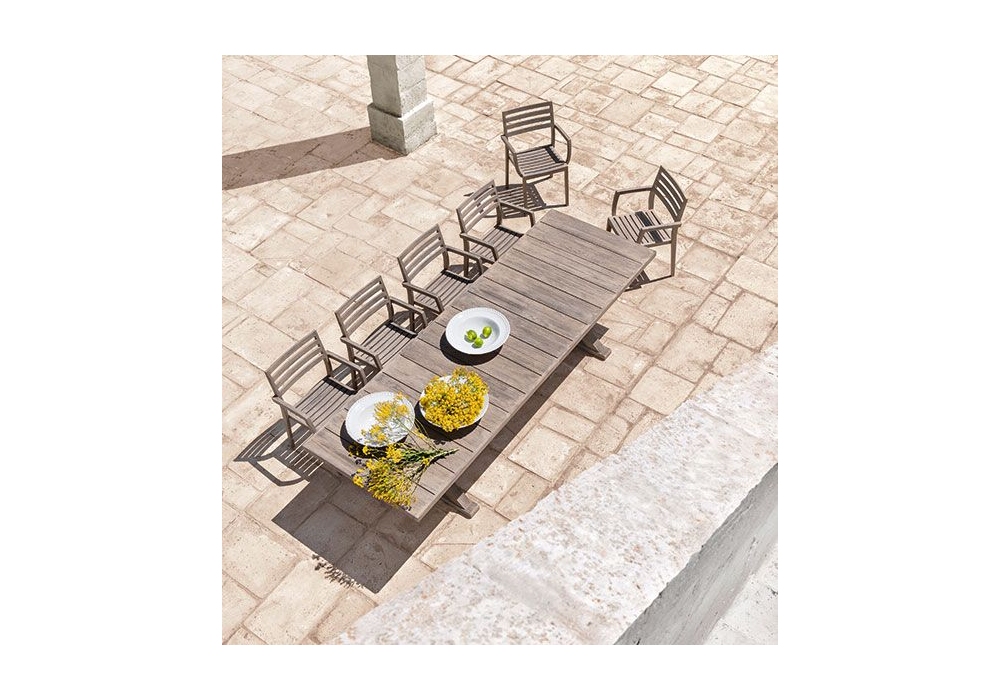 Cronos prodotto e firmato da Ethimo è un tavolo da pranzo estensibile da esterno di forma quadrangolare interamente strutturato in legno teak naturale o decapato.