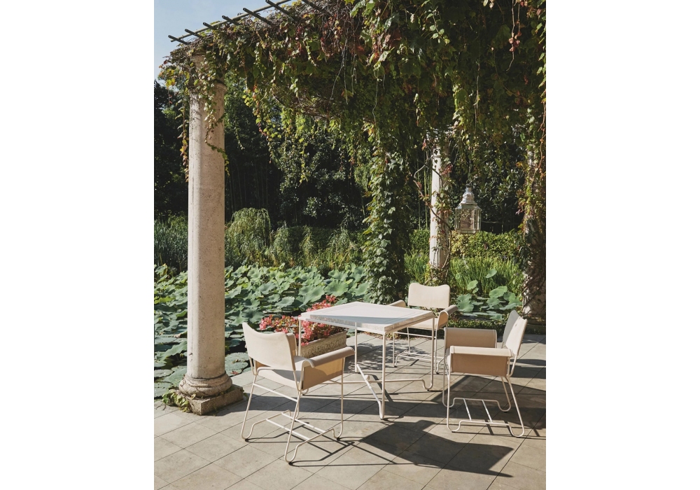 Tropique firmato da Mathieu Matégot per Gubi è un tavolo da esterno con struttura in tondini di acciaio inox.