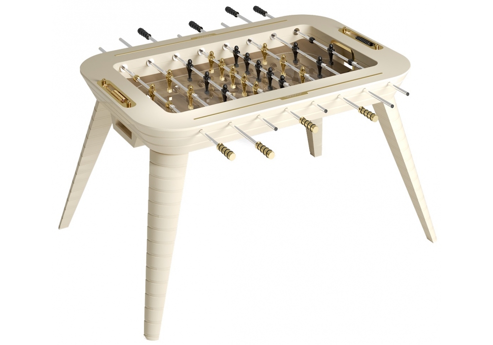 Foosball table disegnato da Vismara Design è un biliardino professionale con campo da gioco in vetro temperato laccato. Giocatori, maniglie e segnapunti realizzati in alluminio. Una squadra placcata in oro 24 kt e l'altra in nichel nero placcato. Struttura in legno laccato. Completo di set da 20 palline di sughero.