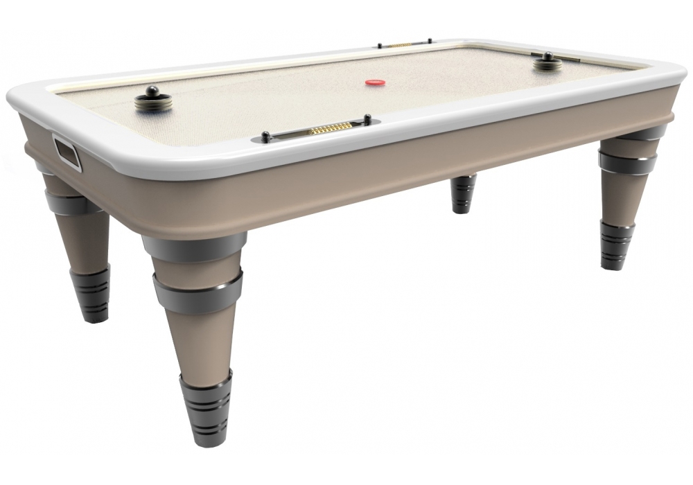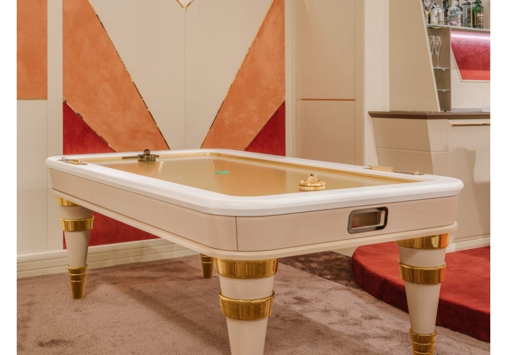 Air Hockey table disegnato da Vismara Design è un tavolo da hockey con motore potenziato, campo da gioco laminato metallico, gambe in legno laccato rivestite in cuoio e parti metalliche, bordi rivestiti in pelle, piano laccato, due dischi inclusi.